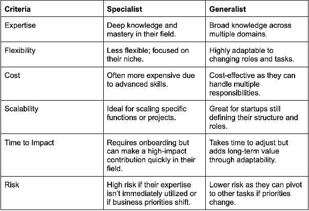 Early-stage startups typically benefit from hiring generalists with versatile skills who can wear multiple hats. For example, a marketing hire might also dabble in graphic design, copywriting, or data analysis. However, as you grow, specialists become crucial for scaling specific functions.